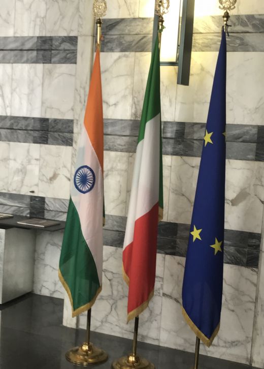 Der italienische Außenminister Enzo Moavero Milanesi und der indische Außenminister Sushma Swaraj heute am 18. Juni 2018 in Rom. Nach einer langen Periode von internationalen Kontroversen: zwei italienische Soldaten erschießen zwei indische Fischer und die indische Polizei im 2013 die zwei Seeleute verhaftete. Heute verbreiteten sich gute Beziehungen zwischen den beiden Ländern einer sehr alten Kultur.